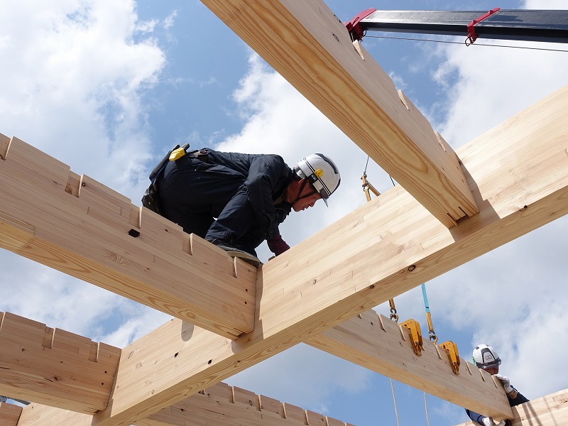 カラマツ集成材の重たい尺梁(梁の高さ寸法が約30cmの梁)をクレーンのオペレーターと息を合わせながら慎重に掛けて行きます。
